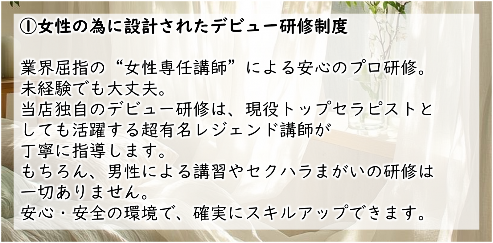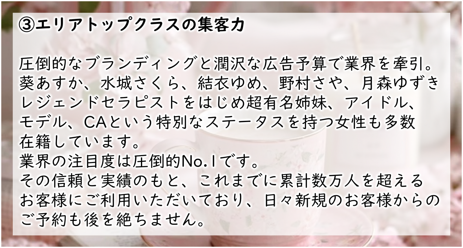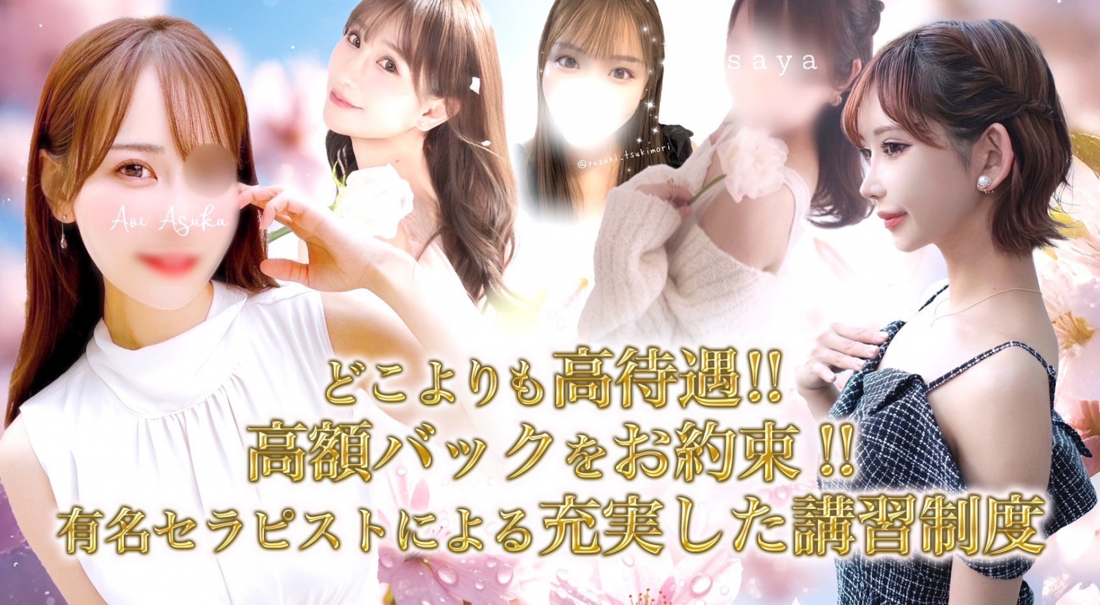 | 待遇 | ・入店祝金制度あり ・体験入店制度あり ・始発までの店泊可(無料) ・お友達と一緒に面接大歓迎 ・取材対応ボーナスあり ・完全個室待機 ・制服貸与 ・エステ資格の取得支援制度 ・アリバイ会社あり ・顔出しNGで勤務可 ・社員登用制度 ※講師・内勤・WEB制作スタッフ等 ・独立開業支援制度 |