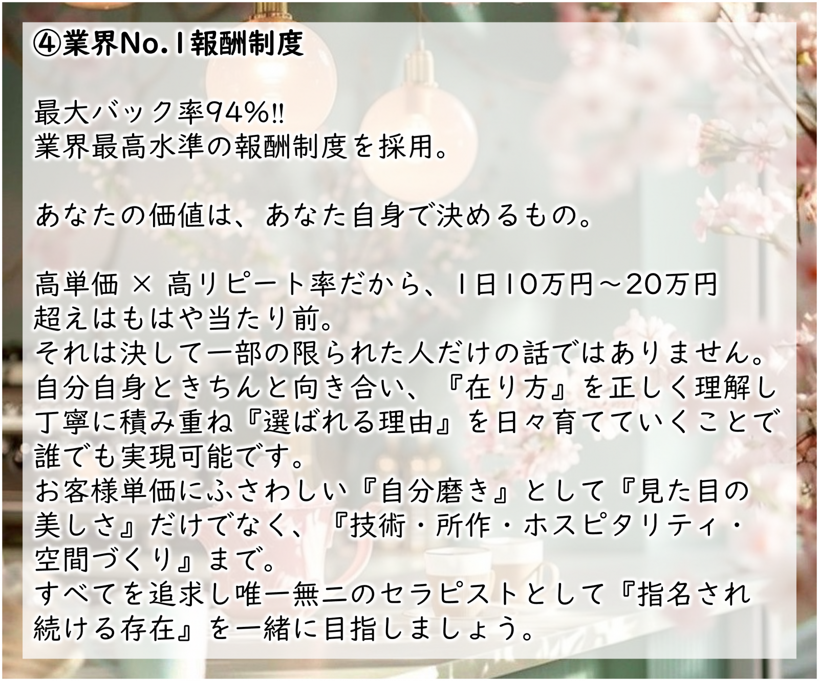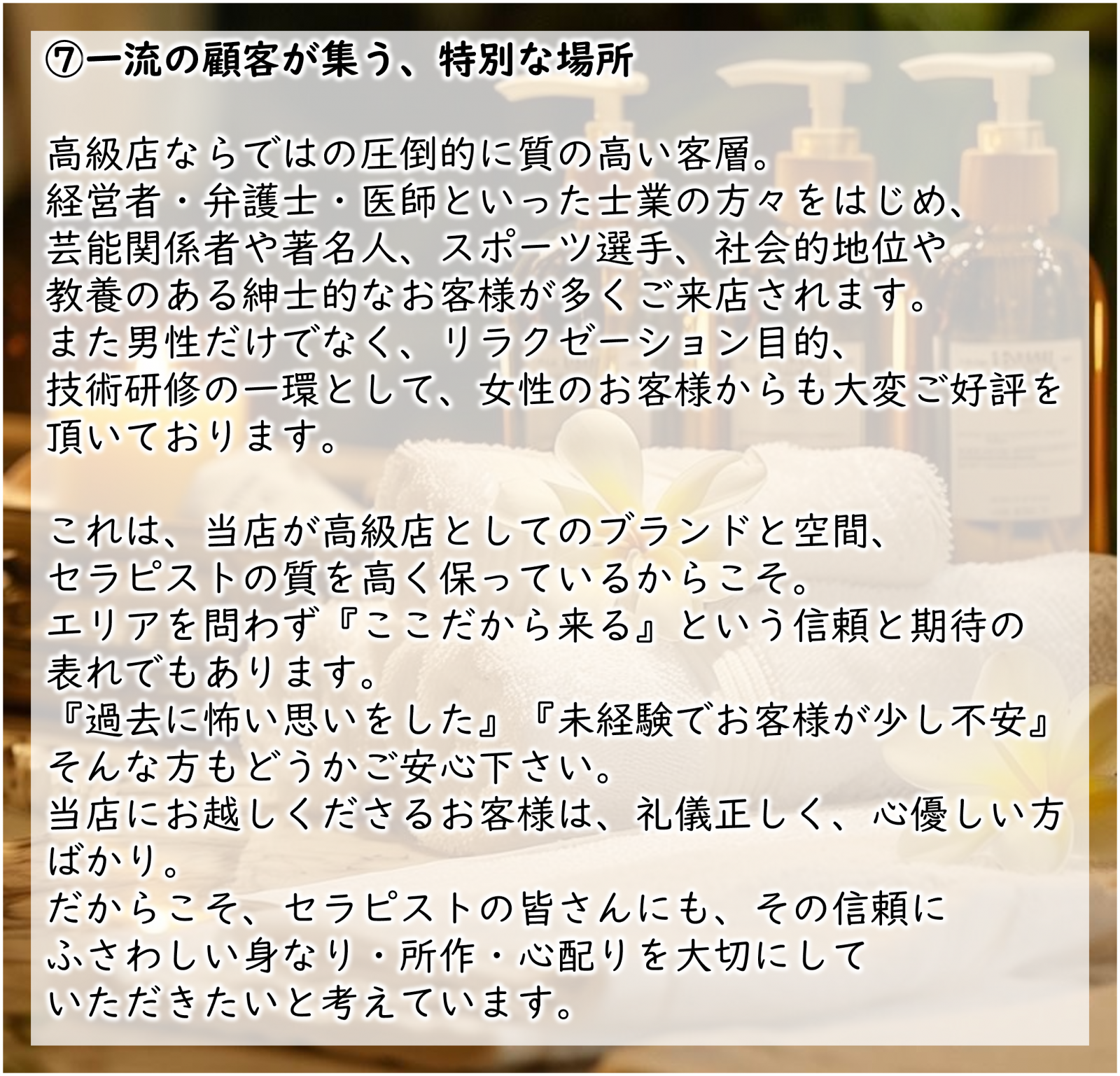 | 業務内容 | 日常のなかで疲れやストレスを抱えている、ただ癒されたい、話を聞いてほしいなど、全てのお客様の心と身体の深い安らぎをお届けするワンランク上の癒しのお仕事です。 ホットオイルを使用し、ゆったりとした空間の中でリラクゼーションマッサージと、お客様の体調や気分に合わせた心を込めたおもてなし。 未経験の方でも一歩ずつスキルを身につけながら、安心してお仕事をスタートしていただけます。 あなたらしく輝ける場所で、心を込めてお客様を癒してみませんか? |