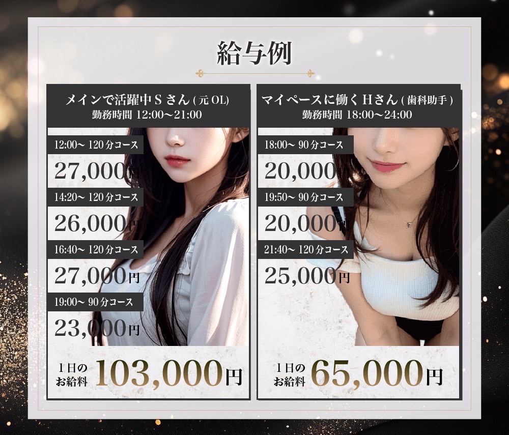 | 給与 | 全国一のバック率‼︎最大94%超え♪ 日給50,000円〜200,000円OVER続出‼︎ 指名料100%バック オプション100%バック 昇給制度あり |