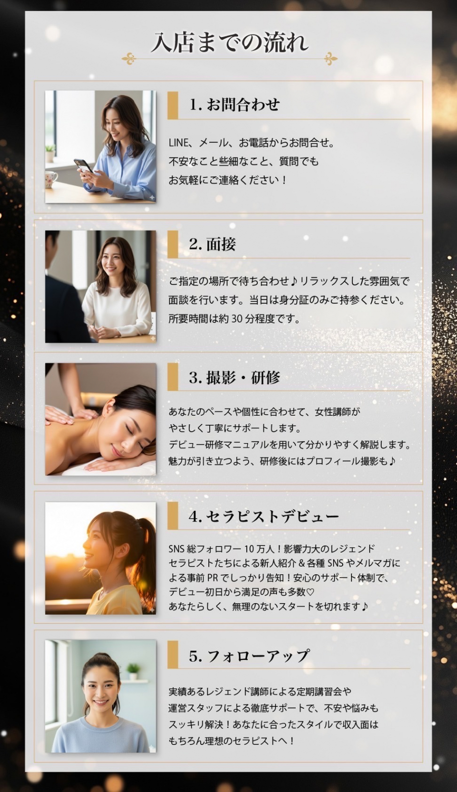 | 応募資格 | 18歳~35歳位迄の健康的で美意識と常識があり、素直で前向きな方 ★未経験者歓迎 ※女性トレーナーによる研修あり ★各種マッサージ経験者歓迎 |